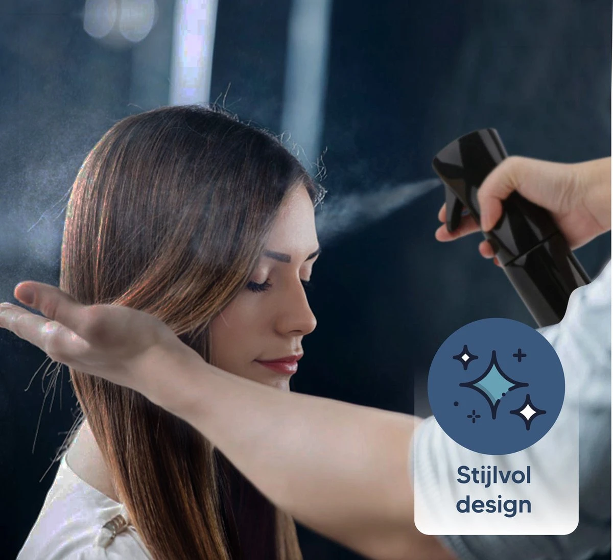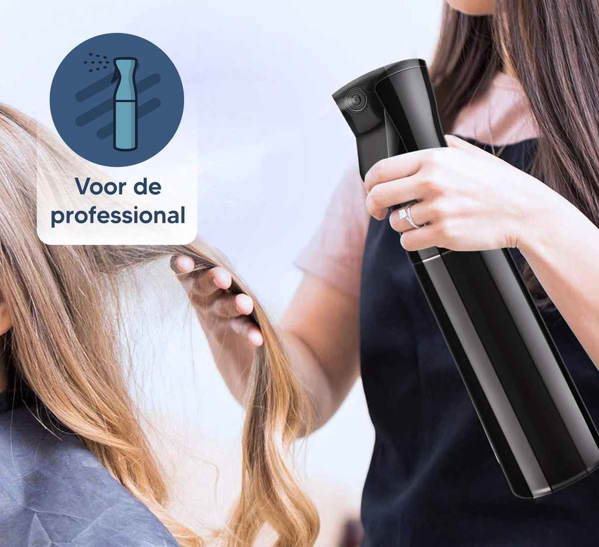 - Lange spray – De 5 seconde lange spray creëert een constante en fijne mist in een perfecte hoeveelheid water om het haar te verzadigen.